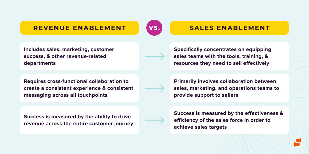 Sales enablement brings sales, marketing, and operations teams together to give sellers the information, technology, and resources needed to effectively close business. Unlike sales enablement, revenue enablement encompasses all revenue-generating departments, such as sales, marketing, and customer success, and customer-facing channels, such as digital commerce and customer service, ensuring that they are equipped to deliver consistent, relevant, and personalized customer experiences.