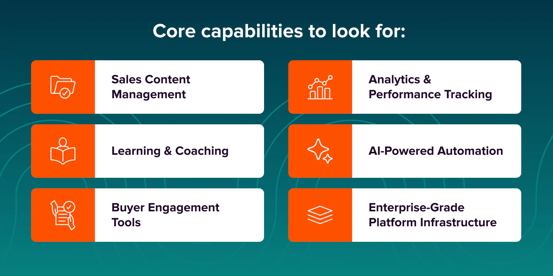 Sales enablement tools include platforms for content management, training and coaching, buyer engagement, and performance analytics. The most effective solutions unify these capabilities to streamline workflows, personalize buyer interactions, and equip sellers to succeed across every stage of the sales cycle.
