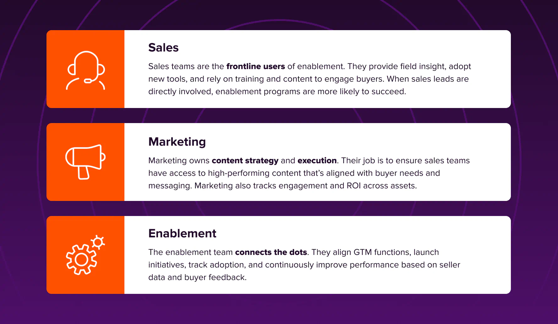 Sales enablement is not a one-team initiative. It's a cross-functional effort that brings together sales, marketing, and enablement teams to support a shared goal: improving seller effectiveness and accelerating revenue.
